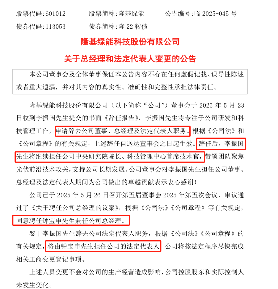 公告显示,隆基绿能董事会于2025年5月23日收到李振国提交的书面《辞任报告》,李振国将专注于公司研发和科技管理工作,申请辞去公司董事、总经理及法定代表人职务。辞任后,李振国将继续担任公司中央研究院院长、科技管理中心首席技术官,带领团队聚焦光伏前沿技术攻关,支持公司长期发展。