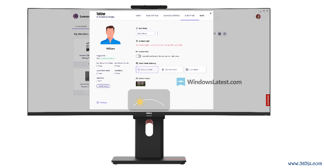 该显示器能够基于用户档案、时间、地理位置等信息,实时调节屏幕亮度、色温及显示参数,以此优化用户的视觉舒适度,减轻眼部疲劳。